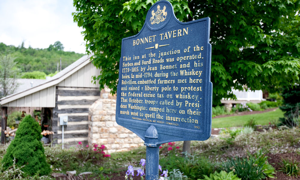 Our namesake, Jean (John) Bonnet, and his wife purchased the property in 1779. In October 1780, Bonnet was issued a license, allowing that “Petitioner lives at the Fork of roads leading to Fort Pitt and the Glades with everything necessary for keeping Public House…”